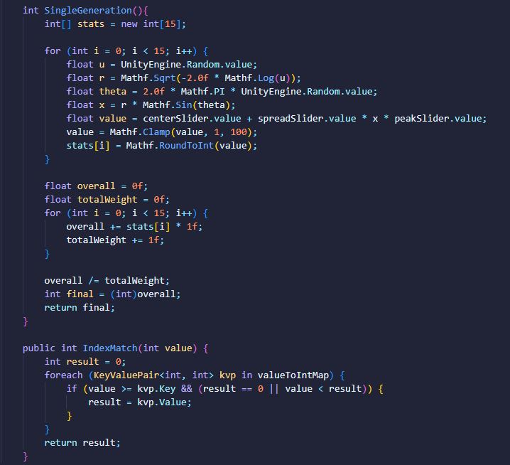 Units, equipment, items and more in this game are stored and represented by cards. Generating cards was an interesting challenge presented by this prototype. Different approaches were explored including Box-Muller transformations and weights. The code snippet shown below generates a character based on a given overall expected stat range. Through a series of mathematical formulas and the Box-Muller transformation algorithm, the code intelligently generates stats for the character. These stats then determine the character's class, skills, and other essential details.