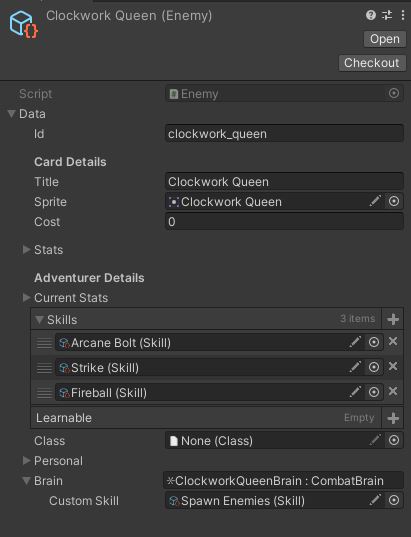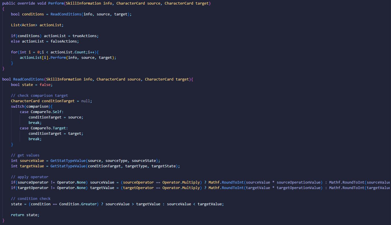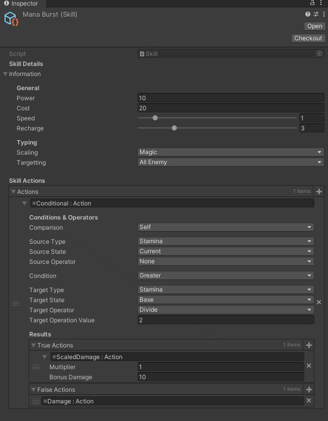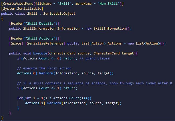 The game's skill system took an approach similar to that of flexible digital card games through the use ScriptableObjects. At the core of the system lies the Skill class, composed of a series of Actions that are executed in a specific order. This design enables rapid creation of new skills, promoting a streamlined and designer-friendly workflow; While leaving the expandability of the system up to the developer or external modders.