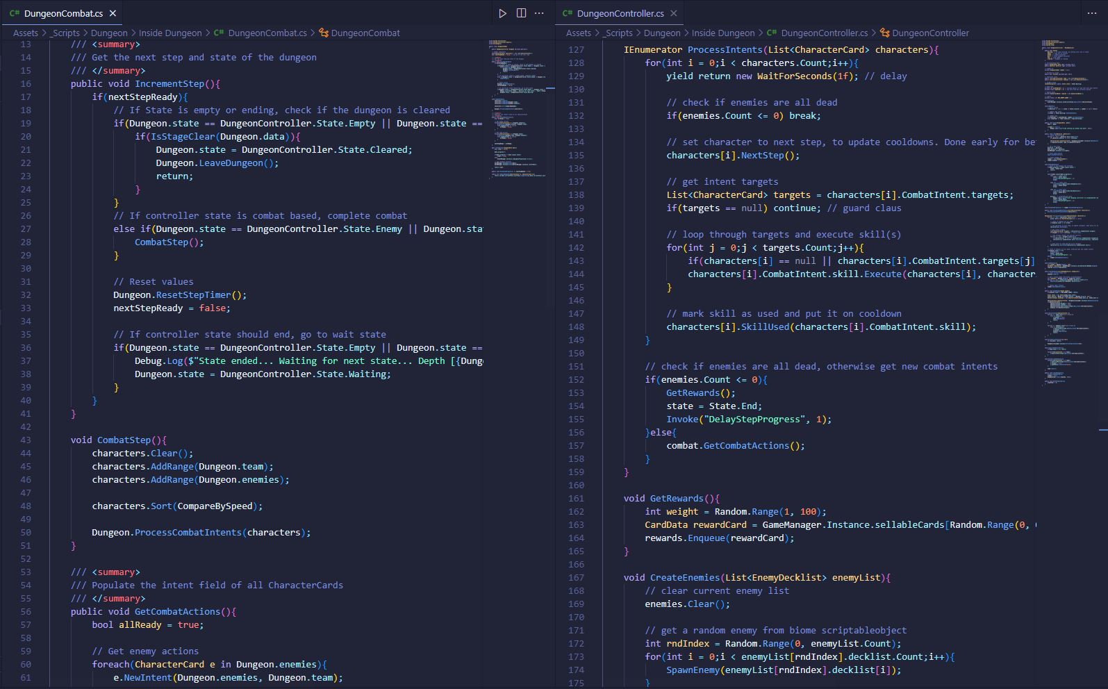A dedicated manager class was created to oversee active dungeons, ensuring smooth coordination and efficient resource management. Additionally, individual DungeonController classes were implemented to handle the logic of each dungeon. These controllers effectively divided tasks into separate classes, including specialized classes for UI management and combat logic.